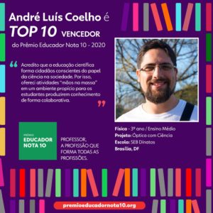 Professor da rede pública desde do ano de 2015, André Luis Miranda de Barcellos Coelho de 31 anos, sempre apostou e acreditou em projetos investigativos no ambiente escolar,o que ainda é um desafio para muitos educadores. A força de vontade, persistência e garra dentro da escola, foi o suficiente para levar o professor de Física a ser um dos vencedores do Prêmio Educador Nota 10, um dos mais importantes do país. Além de ser o único representante do Centro-Oeste, André concorre ao título de Educador do Ano e na categoria de melhor projeto pelo voto popular.