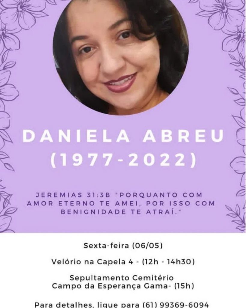 Daniela lecionava Língua Portuguesa, e faleceu muito jovem, aos 45 anos, no hospital Santa Lúcia (Gama central).