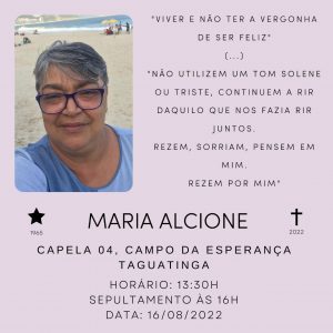 A professora aposentada Maria Alcione Moreira Santos faleceu na noite dessa segunda-feira (15), lutando contra o câncer. O sepultamento da professora será nesta terça (16/8), às 16h, na capela 4 do cemitério Campo da Esperança, em Taguatinga.