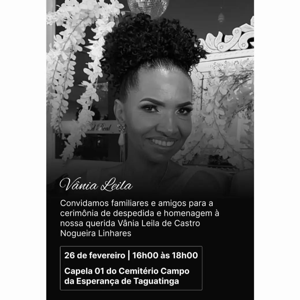 O velório da professora Vânia Leila será neste domingo, 26 de fevereiro, das 16 às 18h, na Capela 1 do Cemitério Campo da Esperança de Taguatinga.