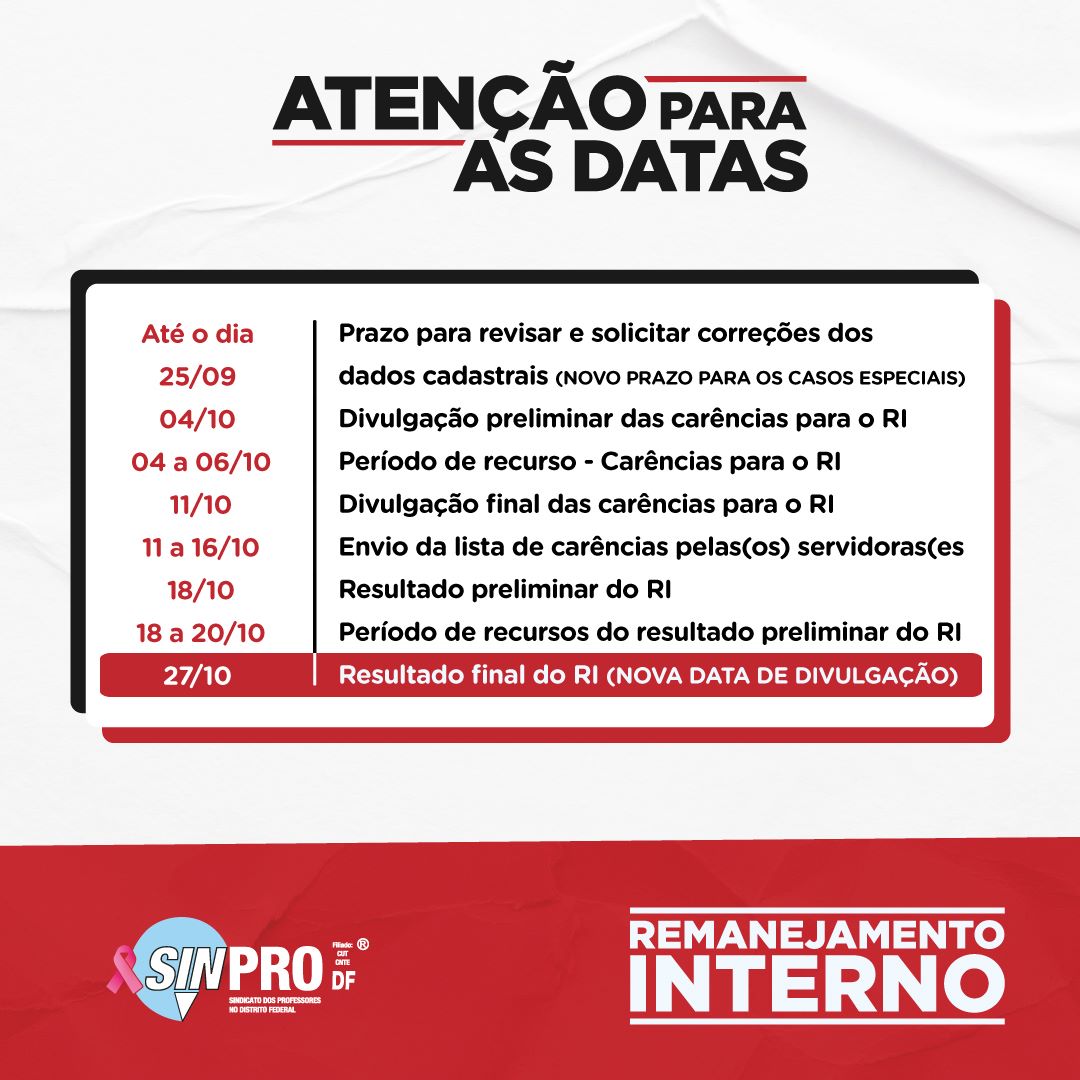 A divulgação do resultado final do Remanejamento Interno 2022/2023 foi adiada para o dia 27 de outubro. Fique atento(a)! O resultado será liberado ao longo do dia e a SEEDF tem até a meia noite para realizar a publicação.