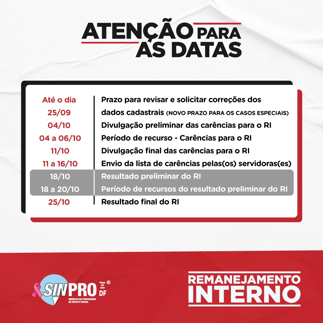 Para auxiliar no processo de remanejamento, o Sinpro preparou uma tabela completa com as datas de todas as etapas e um card. Prepare-se para tirar um print, salvar as informações e não perder nenhum dos prazos.