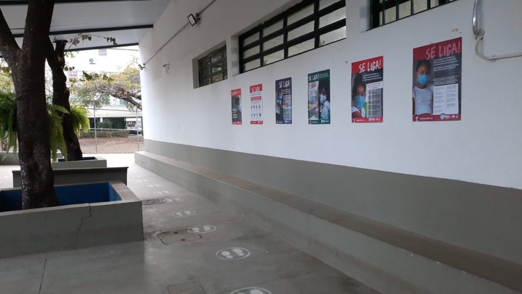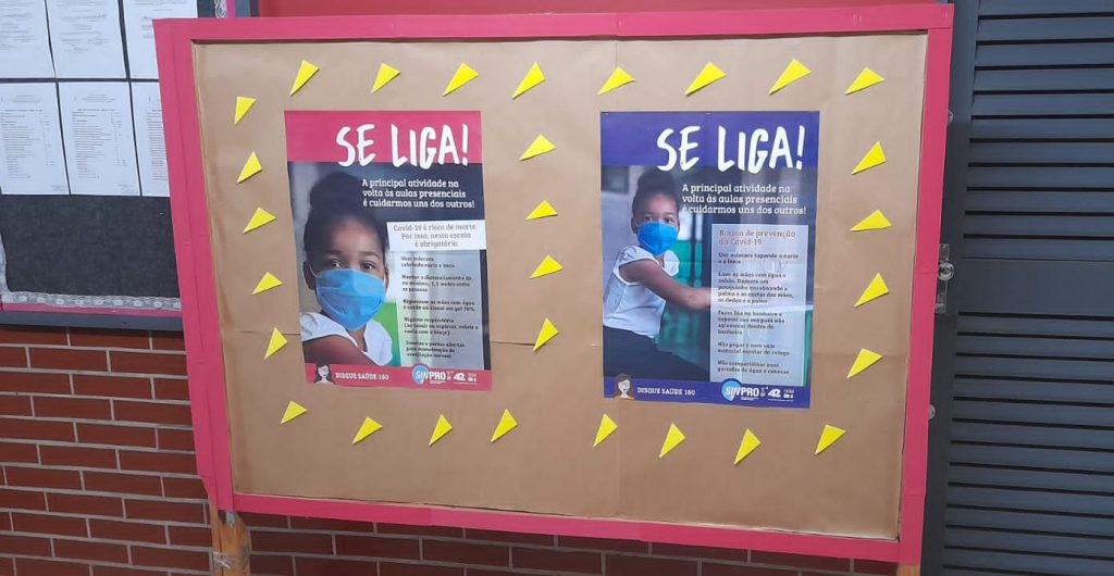 Para contribuir com a discussão desses temas, o Sinpro-DF confeccionou placas de orientação e cartazes que pautam a importância de cada cuidado para prevenir o contágio. Esse material foi enviado às escolas para estarem disponíveis no retorno presencial. “Nossa intenção foi de oferecer um suporte às escolas para informar e para debater a importância das medidas de segurança”, afirma Letícia Montandon, diretora da Secretaria de Imprensa no Sinpro. “É um material gráfico informativo cujo visual dialoga com os estudantes e com o conjunto da comunidade”, destaca.