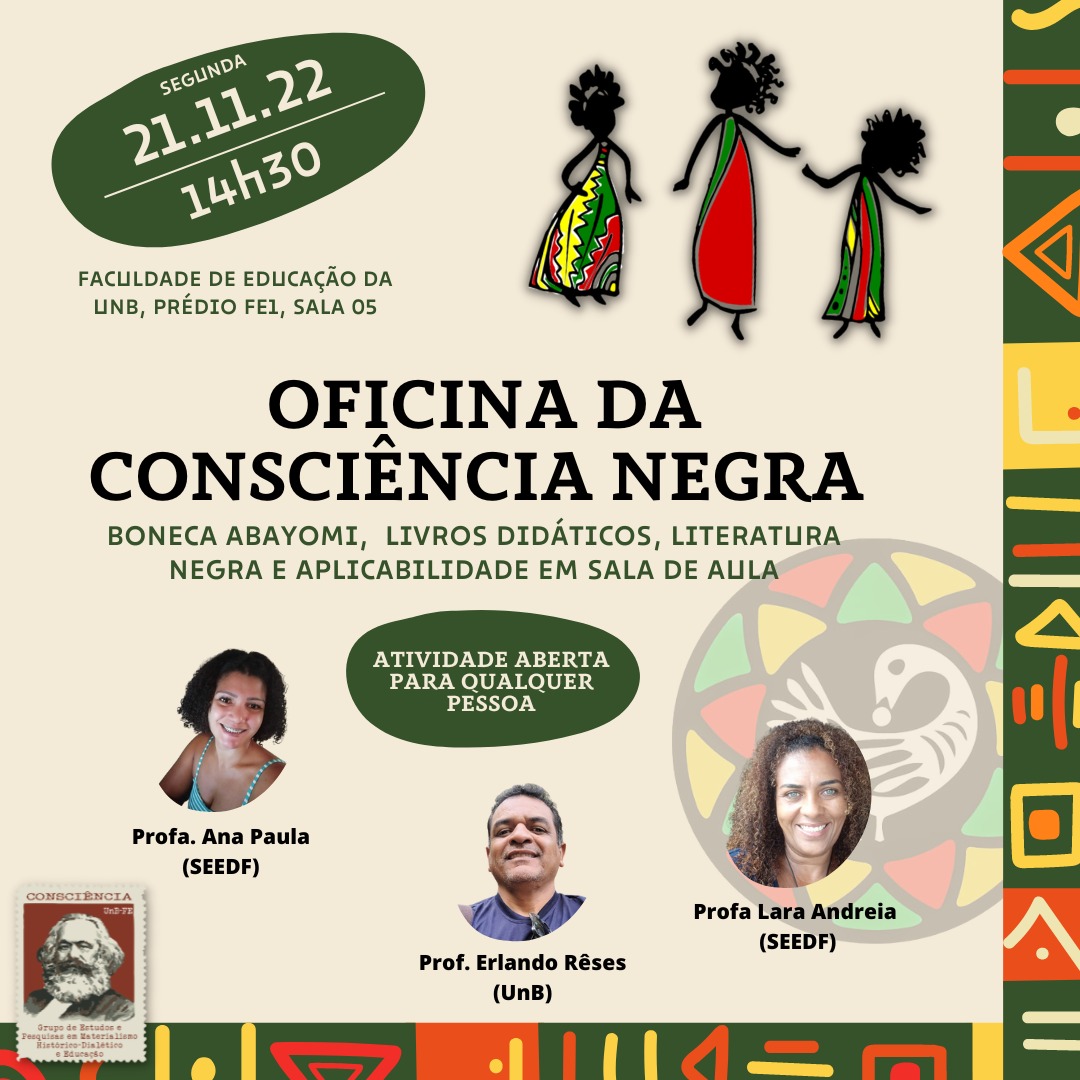 O Consciência, grupo de estudos e pesquisas em Materialismo Histórico-Dialético e Educação, da Faculdade de Educação da Universidade de Brasília (FEUnB), realiza uma oficina que privilegiará a prática de educação no campo da Consciência e Cultura Negra. O evento será realizado no dia 21 de novembro, às 14h30, na sala 05 do Prédio FE1, da FE/UnB.