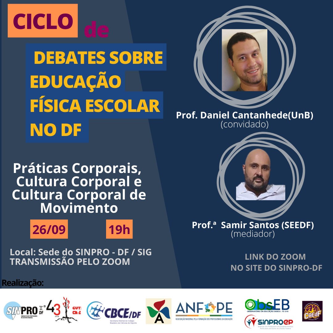 Hoje (26), acontece mais um encontro do 2º Ciclo de Debates sobre Educação Física Escolar do Distrito Federal, que tem como tema “Práticas Corporais, Cultura Corporal e Cultura Corporal de Movimento”. A atividade será realizada no auditório da sede do Sinpro (SIG), às 19h, com transmissão pelo Zoom.