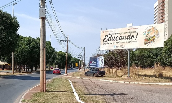 Os outdoors trazem estampados o banner que está no topo de nosso site: uma imagem de Paulo Freire e o texto Apaixonados por transformar, educando! Orgulho de ser professora e professor!