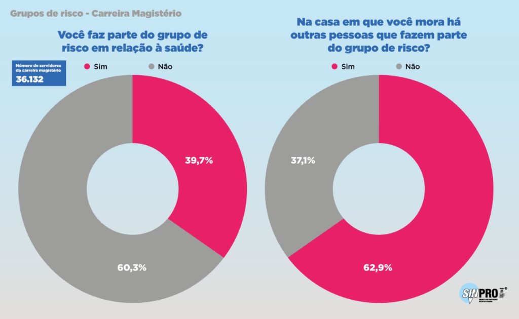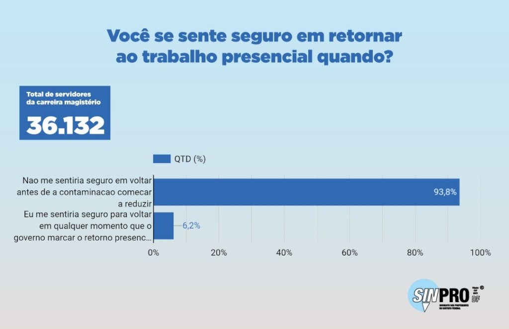 Apenas para 6,20% da categoria se sentiria seguro em retornar ao trabalho presencial no momento em que o GDF determinasse. A pesquisa também revelou que 39,70% da categoria está no grupo de risco e que 62,9% mora com alguém que é do grupo de risco.
