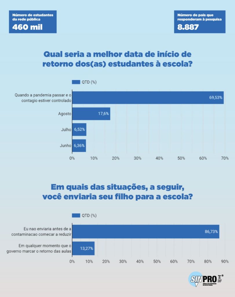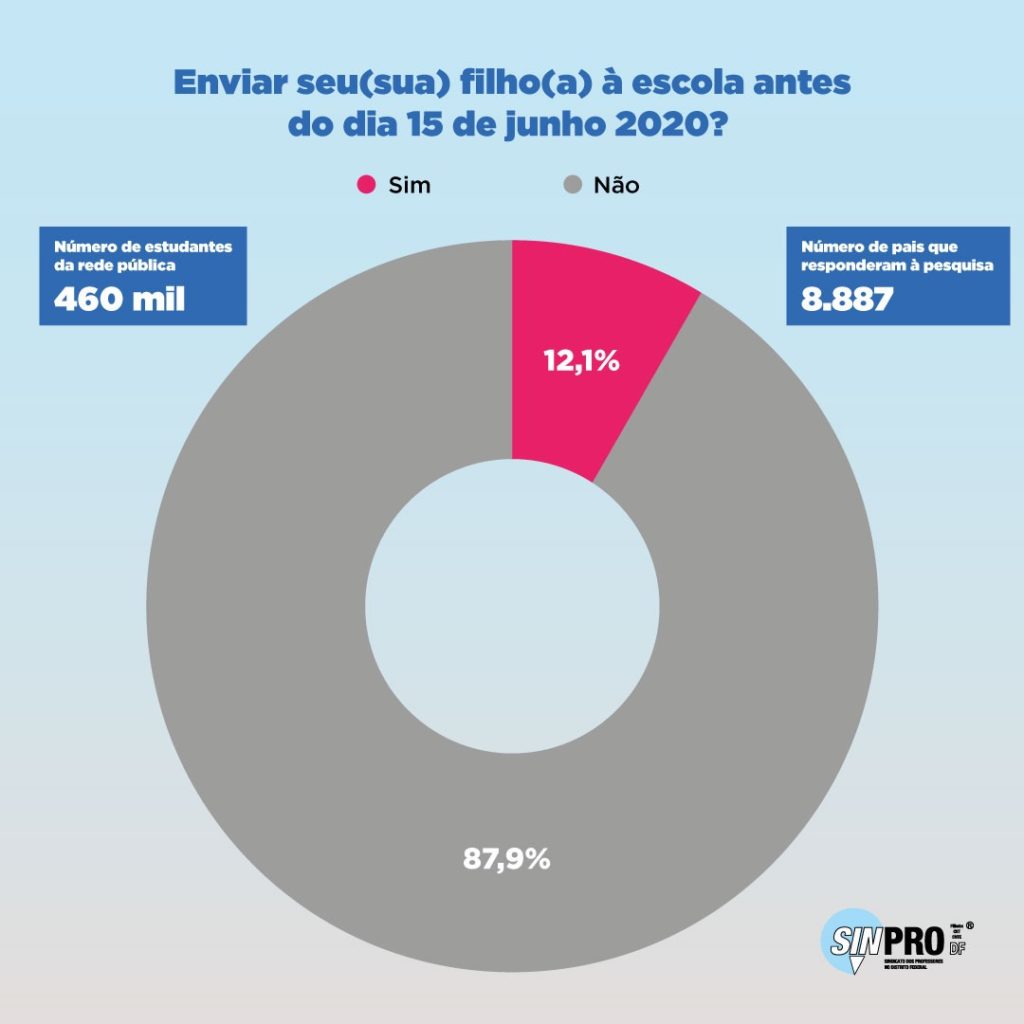 Quando perguntados se o(a) filho(a) ou alguém da casa faz parte do grupo de risco, 68,30% responderam que sim.  Quando perguntados se enviariam os(as) filhos(as) para aulas presenciais a partir do dia 15 de junho, 87,90% disseram que não. Essa foi a data colocada na pesquisa para representar a ideia de retorno imediato, antes do pico da pandemia no DF.