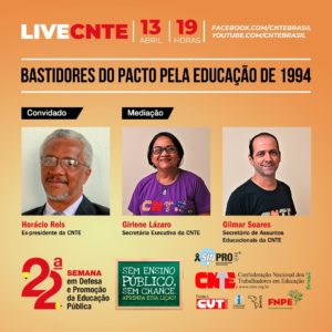O Sinpro-DF convida toda categoria para a live “Bastidores do pacto pela educação de 1994”, realizada hoje (13), às 19h, pelas redes sociais da CNTE. O evento faz parte da programação da 22ª Semana em Defesa e Promoção da Educação Pública, que será realizada entre os dias 26 a 30 de abril de 2021.