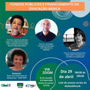 Com objetivo de debater e alertar sobre os fundos públicos e o financiamento da educação básica, o  Observatório da Educação Básica da Faculdade de Educação da Universidade de Brasília- (UnB), convida toda a categoria para o debate  que será promovido nesta quinta-feira (29), às 18h30,  com a participação dos professores(as) e doutores(às), Catarina de Almeida Santos- Faculdade de Educação da Universidade de Brasília- (Unb), Campanha Nacional pelo Direito à Educação Pública, Luíz Araújo- Faculdade de Educação da Universidade de Brasília- (Unb), e membro da Associação Nacional de Pesquisa em Financiamento da Educação- (FINEDUCA), e Francisco José da Silva (“mano”)- Subsecretaria de Formação Continuada dos Profissionais da Educação- (EAPE)  e presidente do conselho do Fundo de Manutenção e Desenvolvimento da Educação Básica do Distrito Federal -(Fundeb). A mediação será feita pela professora Gina Vieira Ponte de Albuquerque- Subsecretaria de Formação Continuada dos Profissionais da Educação- (EAPE) .