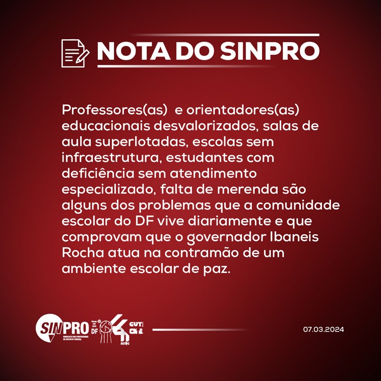 É urgente lembrar que a violência é um problema estrutural da sociedade, gerado fora das escolas e trazido para dentro das salas de aula. Um dos motores geradores dessa realidade é a falta de investimento na educação pública, um retrato atual do Distrito Federal.