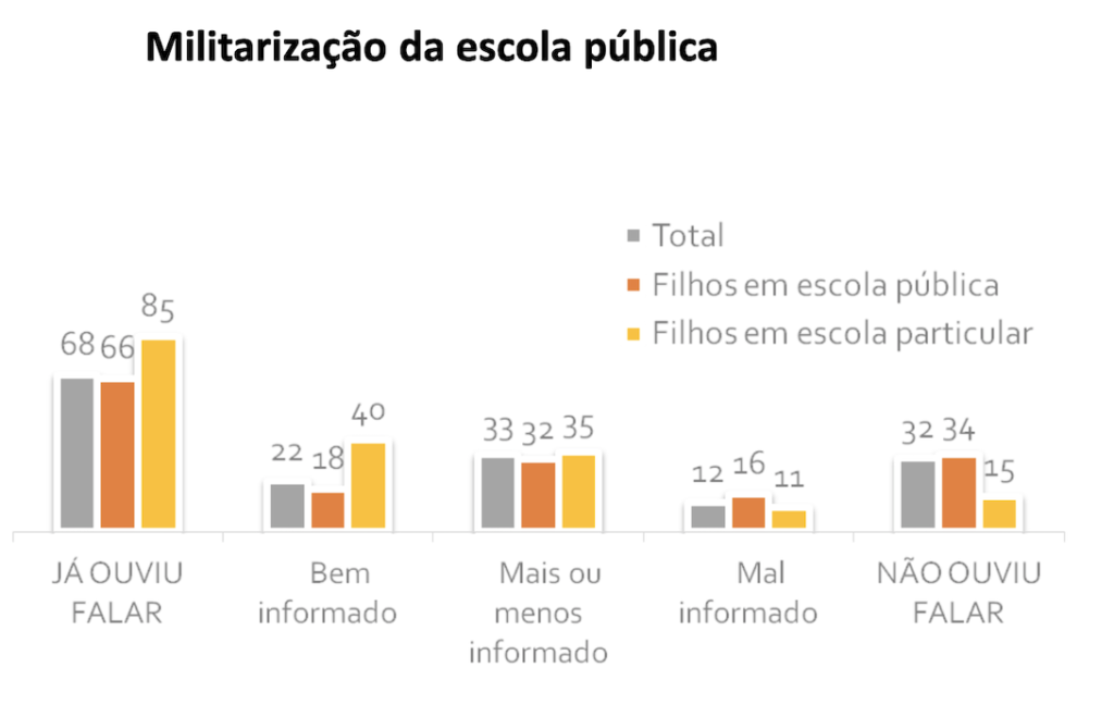 Pesquisa realizada pelo instituto Datafolha e pelo Centro de Estudos em Opinião Pública (Cesop/Unicamp), por encomenda Cenpec (Centro de Estudos e Pesquisas em Educação, Cultura e Ação Comunitária) e da Ação Educativa, aponta que a ampla maioria da população – mais de 70% – confia mais em professores do que em militares para atuar em uma escola.