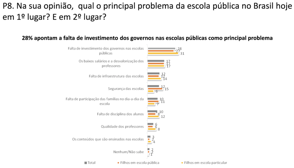 Para a maioria, o principal problema da escola pública é a falta de investimento dos governos (28%), seguida pelos baixos salários e desvalorização dos professores (17%) e pela falta de infraestrutura (12%). A segurança vem em quarto lugar (12%), e a falta de disciplina, somente em sexto (10%). Confira nos gráficos abaixo: