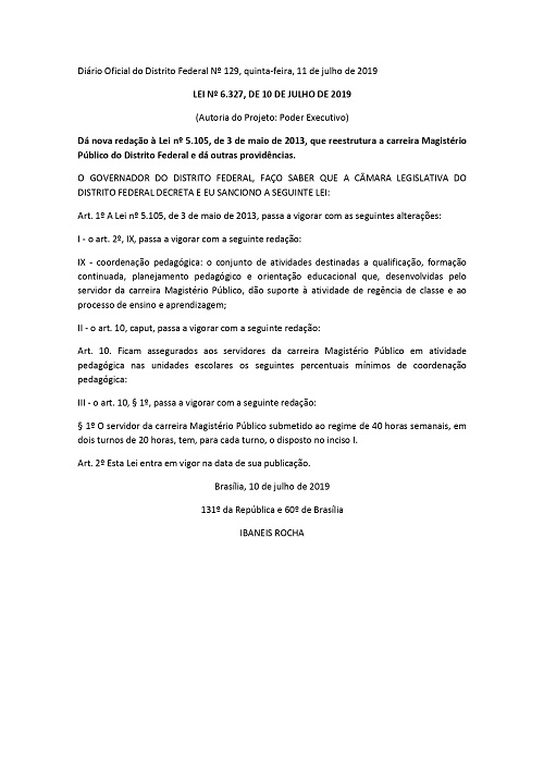A pedido do Sinpro-DF, o Governo do Distrito Federal (GDF) sancionou na última quarta-feira (10), a Lei nº 6.327, de autoria do Executivo, que faz alterações no Plano de Carreira do Magistério Público. Agora, assim como os trabalhadores em regência de classe, profissionais em situação de trabalho fora da regência também terão direito à coordenação pedagógica.