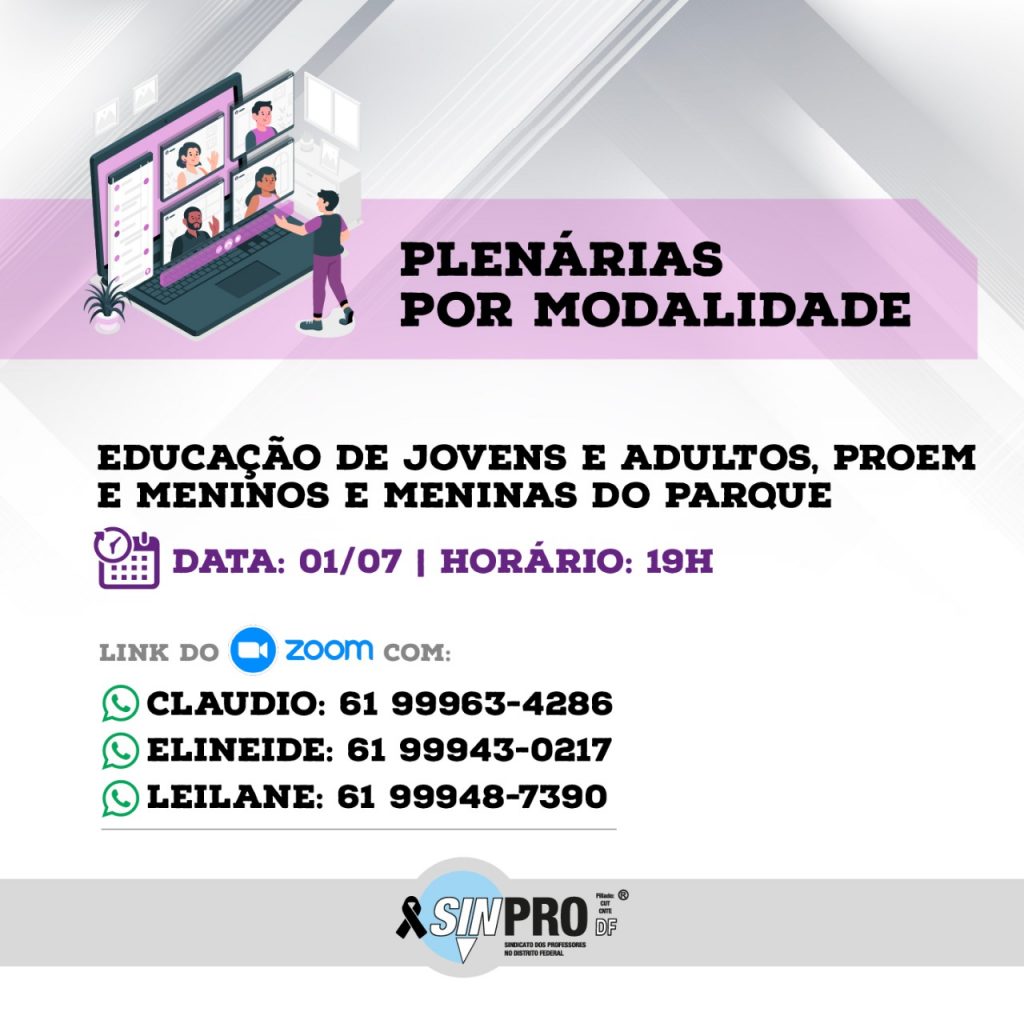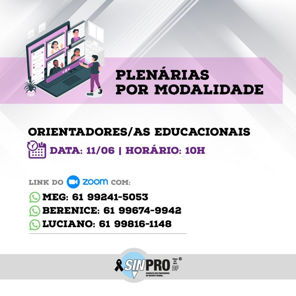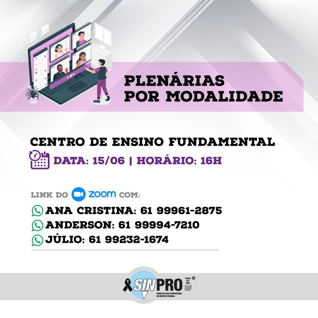 “È imprescindível a participação de todos e todas nas plenárias por modalidade. Compartilhe com seus colegas e nos grupos da sua escola, e reserve este momento na sua agenda para participar da atividade”, reforma a diretoria do Sinpro-DF.