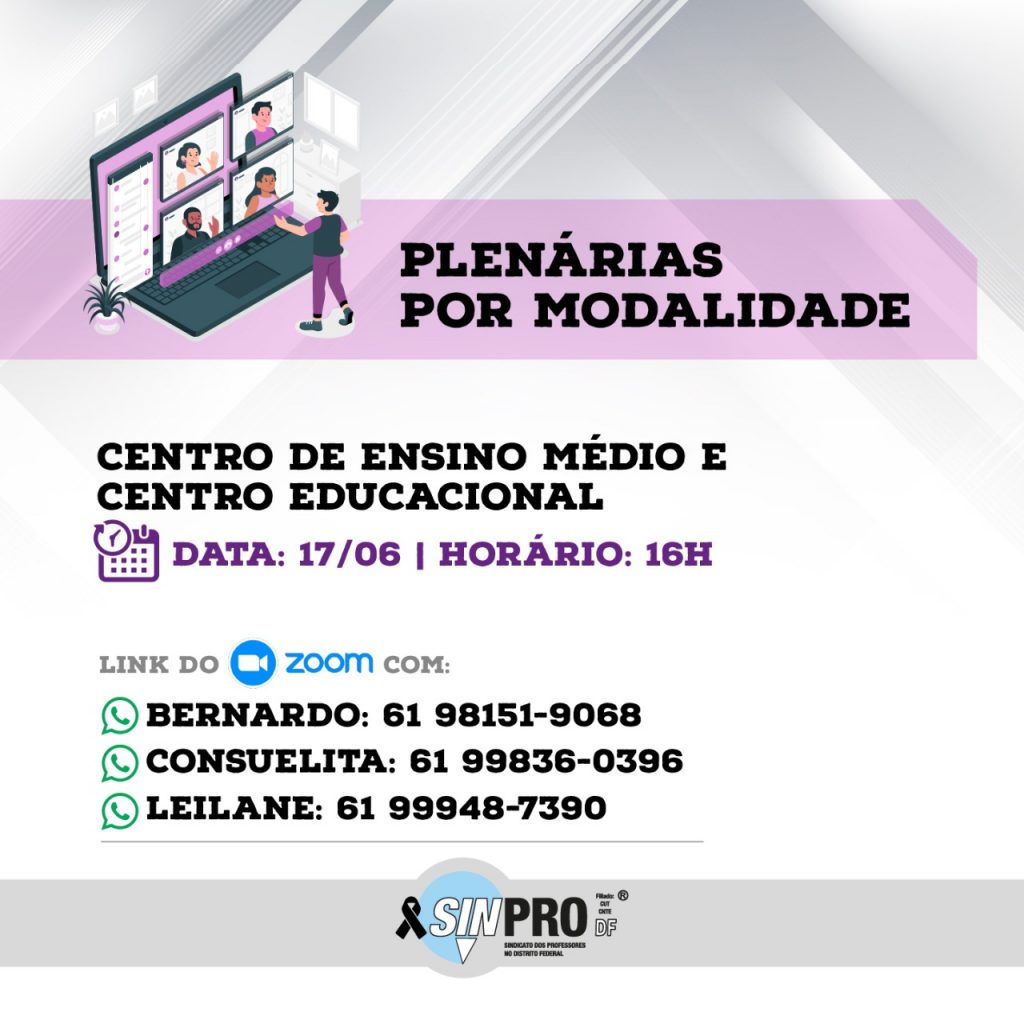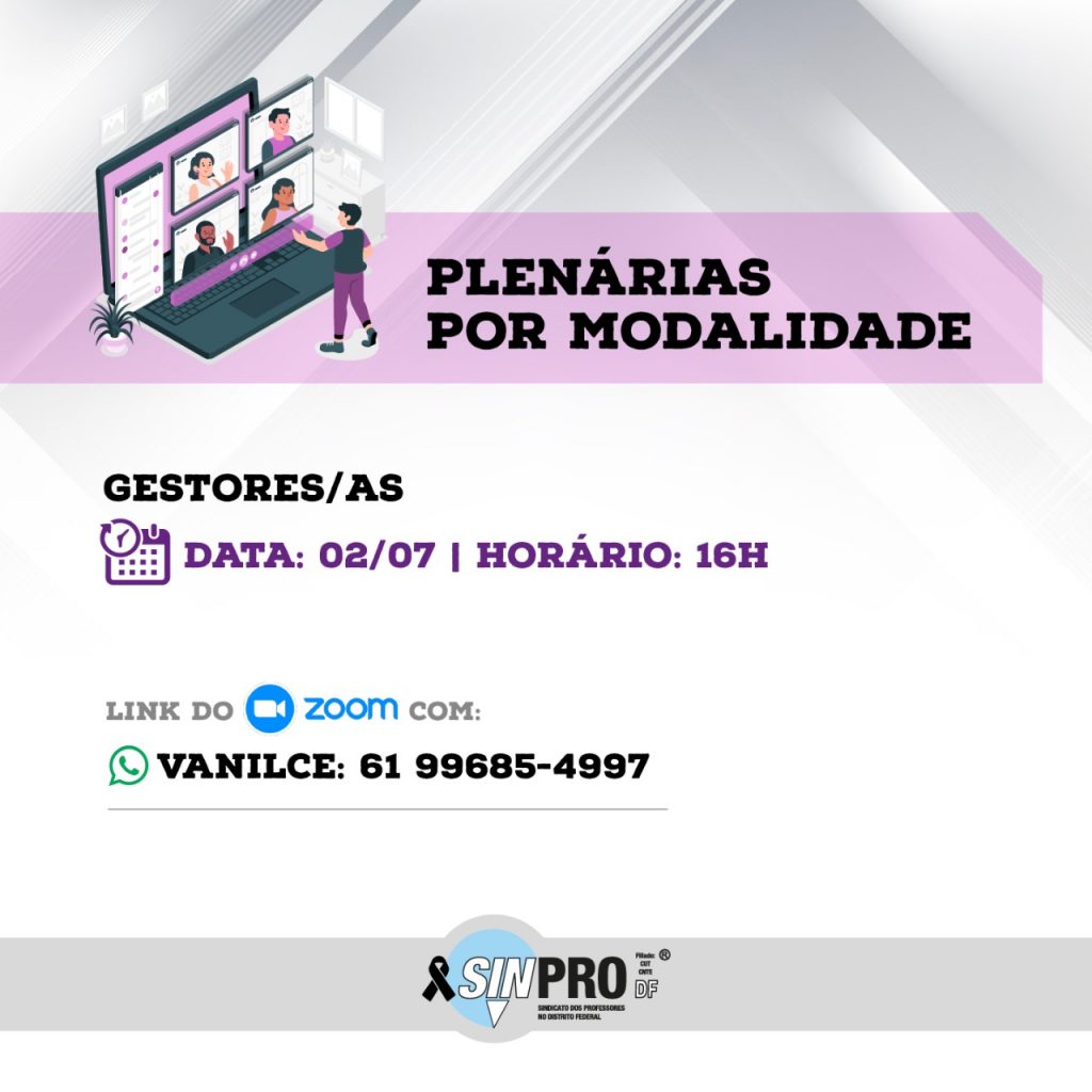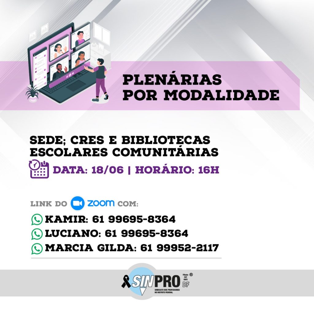 As Plenárias por Modalidade começaram no dia 20 de maio e vão até dia 2 de julho. Elas são encaminhamento da Assembleia Geral da categoria, realizada no último dia 13 de maio. O objetivo é dar andamento ao Calendário de Mobilizações, deliberado também da Assembleia Geral. Entre os pontos de pauta das plenárias estão o combate à reforma administrativa e ao PL 5595 (retorno presencial às escolas mesmo sem vacina); a derrubada do veto ao PL 3477 (garantia de acesso à internet para fins educacionais); a defesa de vacina já contra a covid-19 para toda a população; nomeações e realização de concurso público; e o pagamento imediato da última parcela do reajuste salarial conquistado em 2012, devida pelo GDF desde 2015.