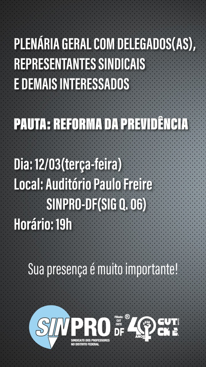 O Sinpro, por meio da Secretaria de Formação, convida todos(as) os(as) Delegados(as), Representantes Sindicais e interessados(as) para Plenária Geral no dia 12 de março, às 19h, no Auditório Paulo Freire (SIG Quadra 6, Lote 2260). A plenária terá como pauta a reforma da Previdência e tem o objetivo de debater este tema que mexe com a vida e o futuro de toda a classe trabalhadora, além de discutir estratégias de mobilização e luta, municiando-nos para os desafios que deveremos enfrentar daqui para frente.