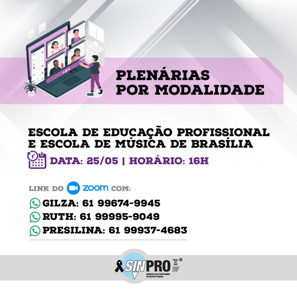A diretoria do Sinpro ainda informa que os horários das plenárias podem ser alterados caso haja, na mesma data, outras atividades gerais ou mobilizações de última hora. Toda e qualquer mudança será avisada na nossa página e em nossas redes sociais.
