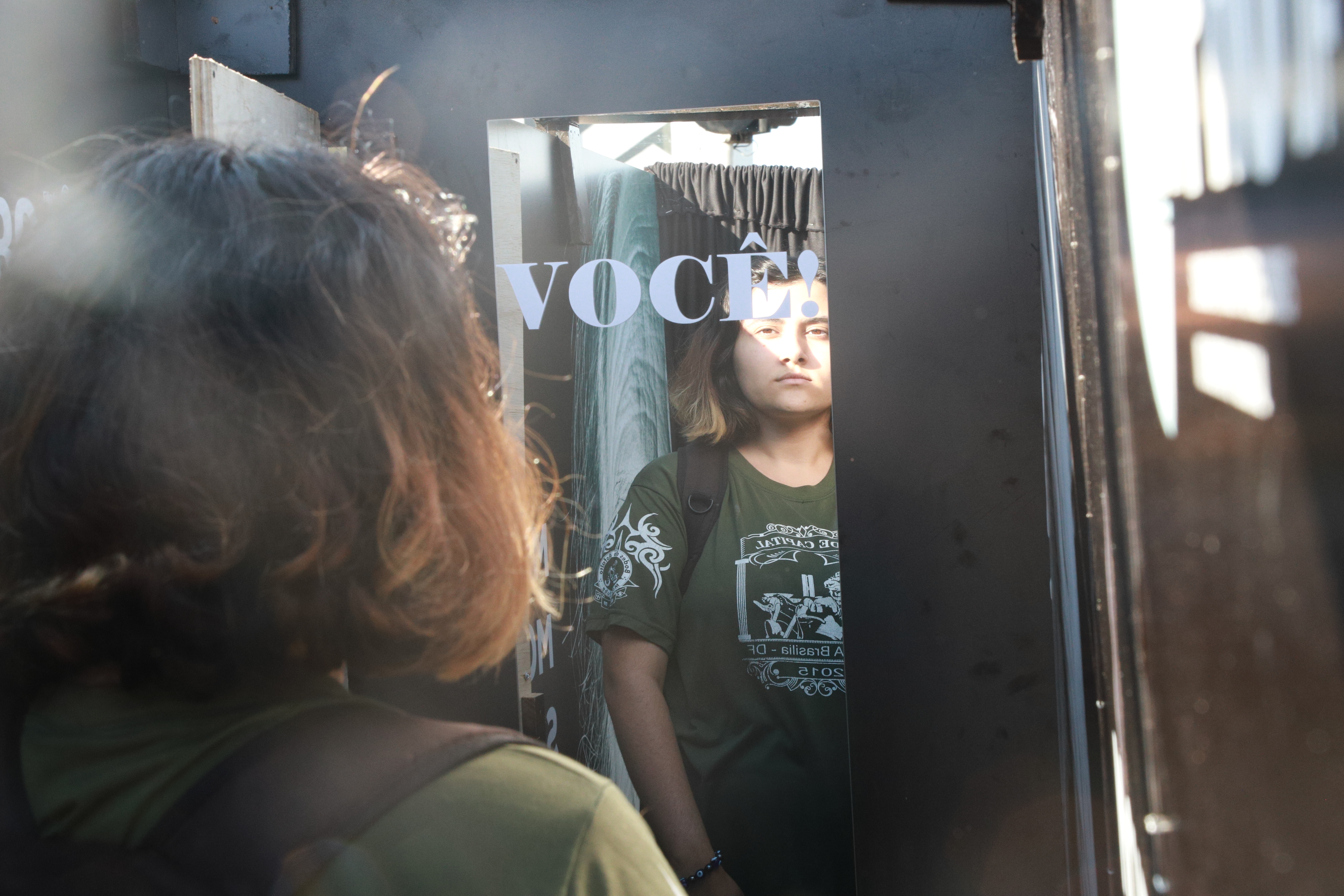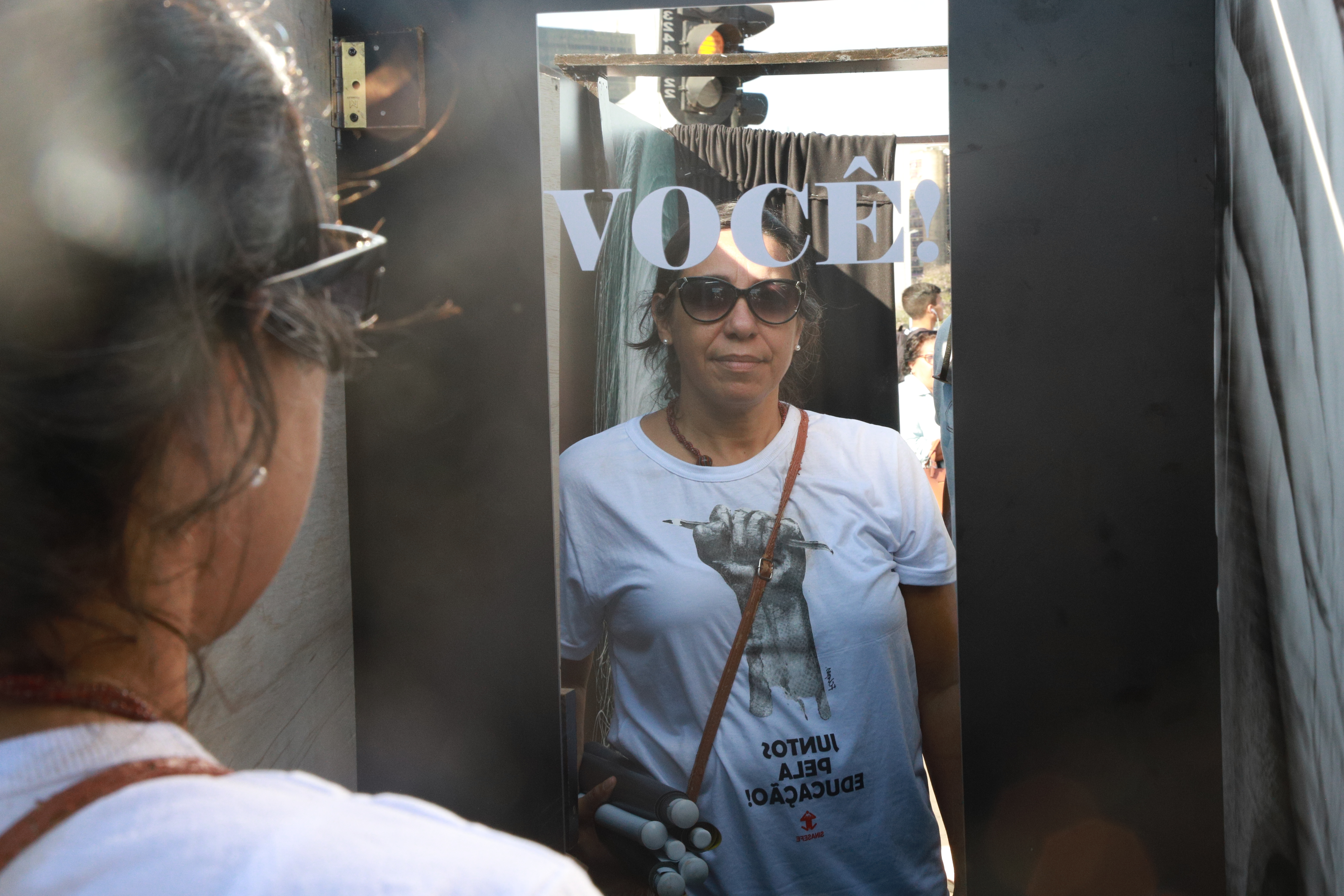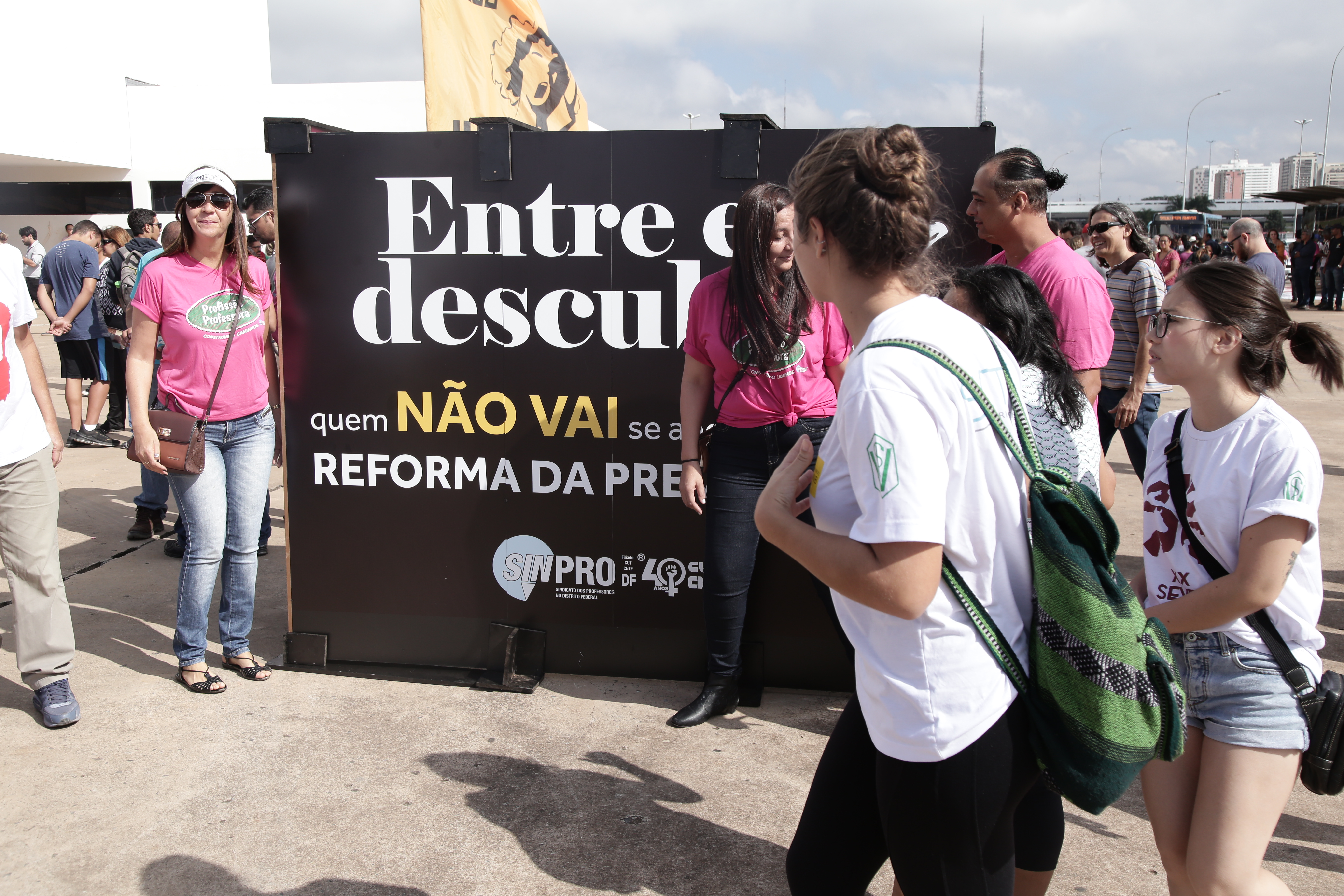 O Sinpro apresentou nessa quarta-feira (15), durante a Greve Nacional da Educação, uma abordagem lúdica para explicar à população o que a reforma da Previdência fará caso seja aprovada. Em uma cabine, o cidadão é convidado a entrar para descobrir quem é a pessoa que não vai se aposentar com a reforma de Jair Bolsonaro. Ao passar pela cortina e entrar na cabine, a pessoa se depara com uma pergunta (Quem não vai se aposentar com a reforma da Previdência) e uma porta. Ao abrir, descobre que é ele mesmo que vai ficar sem se aposentar.