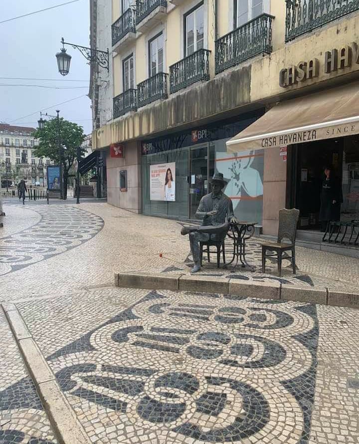 Rua Garrett, em Lisboa, Portugal, com a estátua de Fernando Pessoa. Ponto turístico, em abril, durante a pandemia. Foto: Teresa Araújo Costa