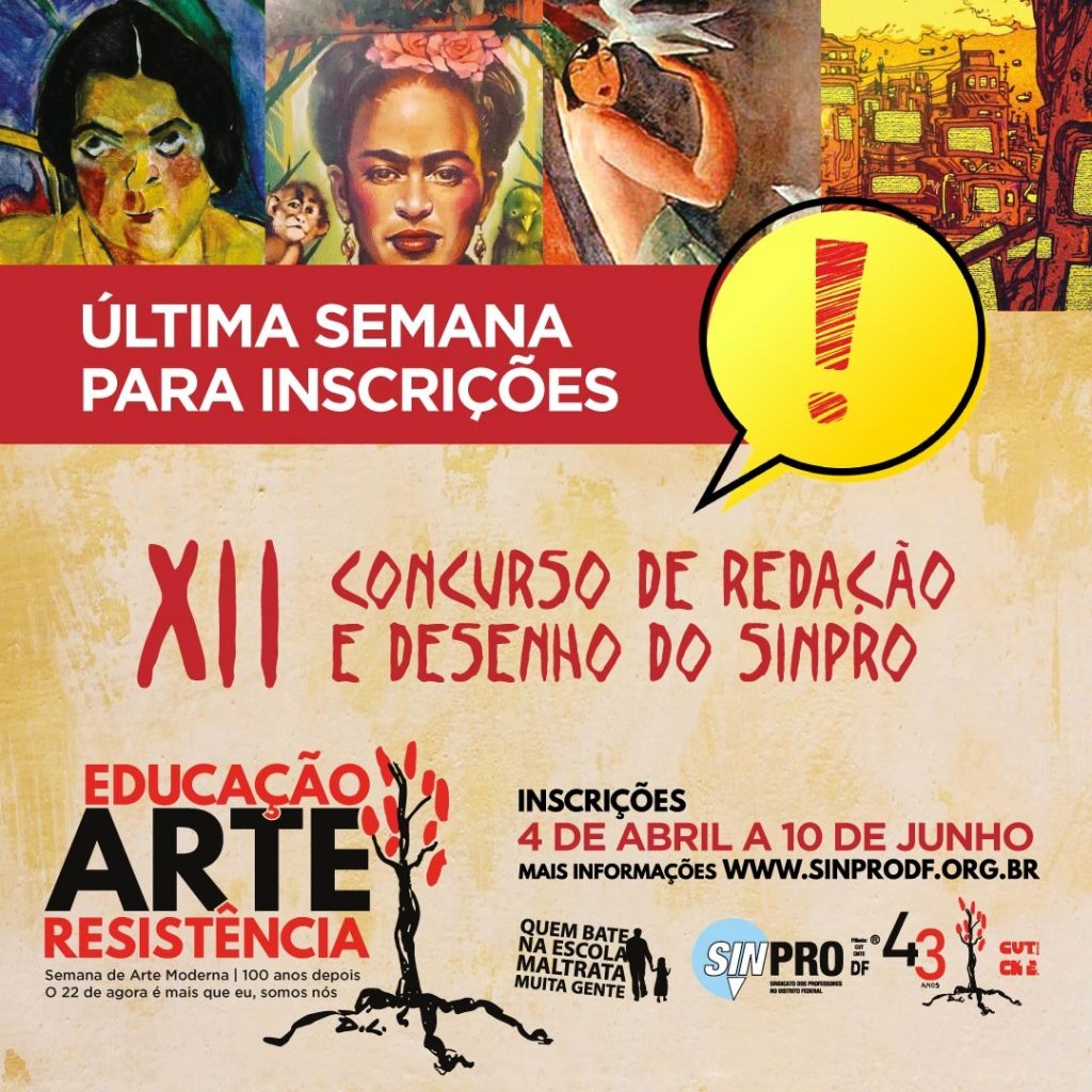 Termina nesta sexta-feira (10) o prazo de inscrição do XII Concurso de Redação e Desenho do Sinpro-DF. A diretoria colegiada do sindicato convida todos e todas a participar da atividade. O tema deste ano é “Semana de Arte Moderna: 100 anos depois – O 22 de agora é mais que eu, somos nós”. A atividade, direcionada a estudantes da rede pública de ensino, é gratuita, e as inscrições estarão abertas até o dia 10 de junho, pelo link.