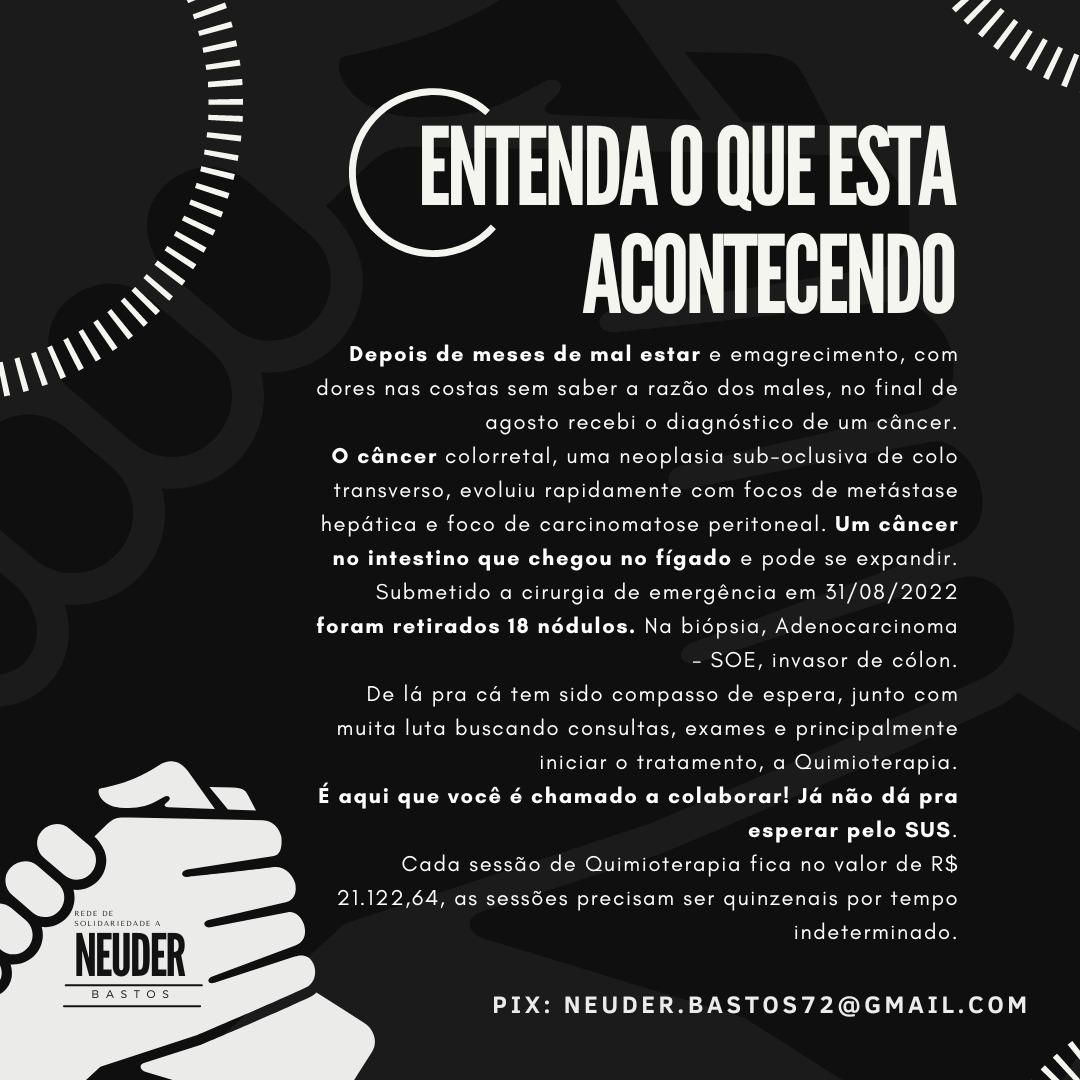 O professor Neuder Bastos pede a ajuda da categoria para o tratamento de um câncer. Após meses de mal-estar, emagrecimento e muitas dores nas costas, no final de agosto o educador foi diagnosticado com um câncer colorretal, uma neoplasia suboclusiva de colo transverso que evoluiu rapidamente com focos de metástase hepática e foco de carcinomatose peritoneal. O câncer no intestino chegou no fígado e pode se expandir.