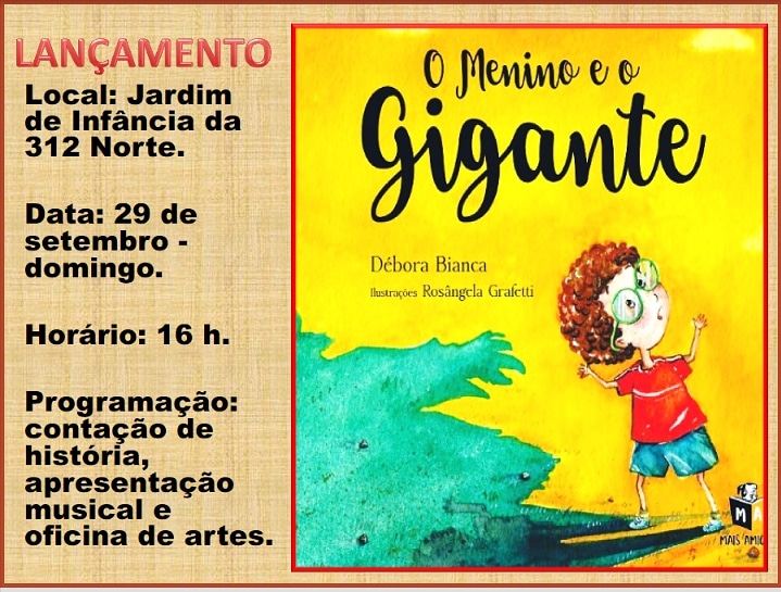 Uma história repleta de superação, solidariedade e amizade é a tônica do livro O menino e o gigante, que será lançado neste domingo (29), às 16h, no Jardim de Infância da 312 Norte. A obra é indicada para estudantes da Educação Infantil até o 3º Ano.