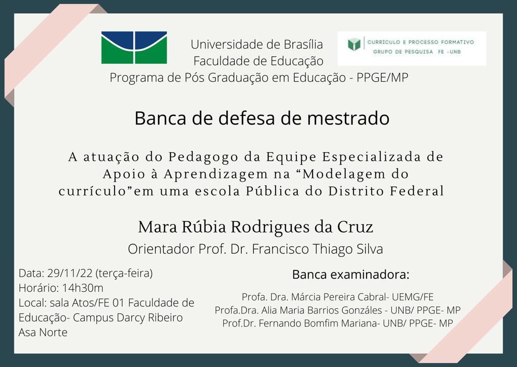 A atuação do Pedagogo da Equipe Especializada de Apoio à Aprendizagem na “Modelagem do currículo” em uma escola pública do Distrito Federal, tema tão caro para o magistério público, foi ponto de pesquisa da professora da rede pública de ensino do DF, Mara Rúbia Rodrigues da Cruz. No dia 29 de novembro, às 14h30, a educadora faz a defesa de dissertação de mestrado na Faculdade de Educação da Universidade de Brasília e convida a categoria para acompanhar. A defesa ocorrerá na Sala de Atos da Faculdade de Educação da UnB (FE/UnB).