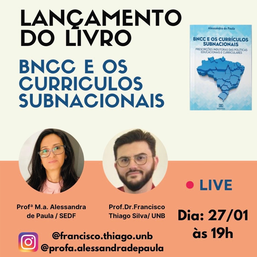 A professora Mestre Alessandra de Paula, em parceria com o professor Doutor Francisco Thiago Silva, convida a categoria para o lançamento do livro BNCC e os currículos subnacionais, que será feito durante uma Live nesta quinta-feira (27), às 19h, pelos canais @francisco.thiago.unb e @profa.alessandradepaula. A obra analisou as relações estabelecidas entre a Base Nacional Comum Curricular (BNCC) e os currículos subnacionais, compreendendo que esse encontro é o ponto de partida para as políticas educacionais e curriculares. Nesse contexto, foi analisada a forma pela qual as unidades da federação atualizaram seus currículos à luz da BNCC.