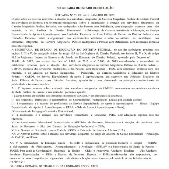 Segundo a Portaria 55, as normas estão relacionadas, dentre outras coisas, à carga horária de trabalho em atividades de docência; aos requisitos, atribuições e quantitativos de Coordenadores Pedagógicos Locais, por unidade escolar; à organização e à atuação do profissional do Serviço Especializado de Apoio à Aprendizagem (SEAA), Equipe Especializada de Apoio à Aprendizagem (EEAA) e Sala de Apoio à Aprendizagem (SAA); à atuação do Pedagogo-Orientador Educacional; à modulação e à atuação dos servidores readaptados e servidores PcDs, com adequação expressa para não regência; ao Atendimento Educacional Especializado (AEE)/Salas de Recursos, Itinerância e à atuação do professor das Salas de Recursos (SR) dos Centros de Educação Profissional (CEP); ao Serviço de Orientação para o Trabalho (SOT) na Educação de Jovens e Adultos (EJA), bem como dos servidores ocupantes do cargo de Analista de Gestão Educacional – Psicologia, da CAEDF, no SEAA.