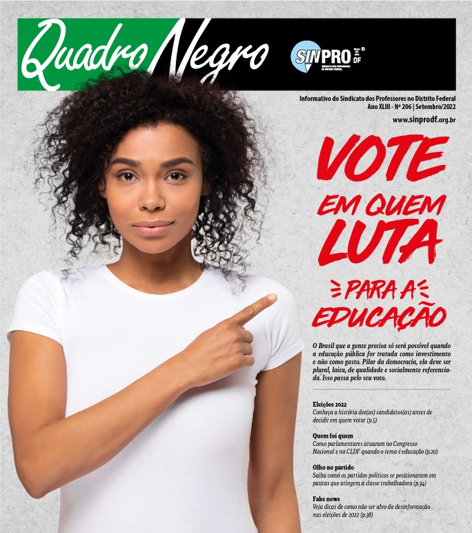 Nesta edição, o Quadro Negro reúne informações que ajudam a categoria a decidir o voto. Entre os temas abordados, estão as principais propostas para a educação apresentadas no plano de governo dos(as) candidatos(as) que estão à frente nas intenções de voto para a presidência da República, para o GDF e para o Senado Federal.