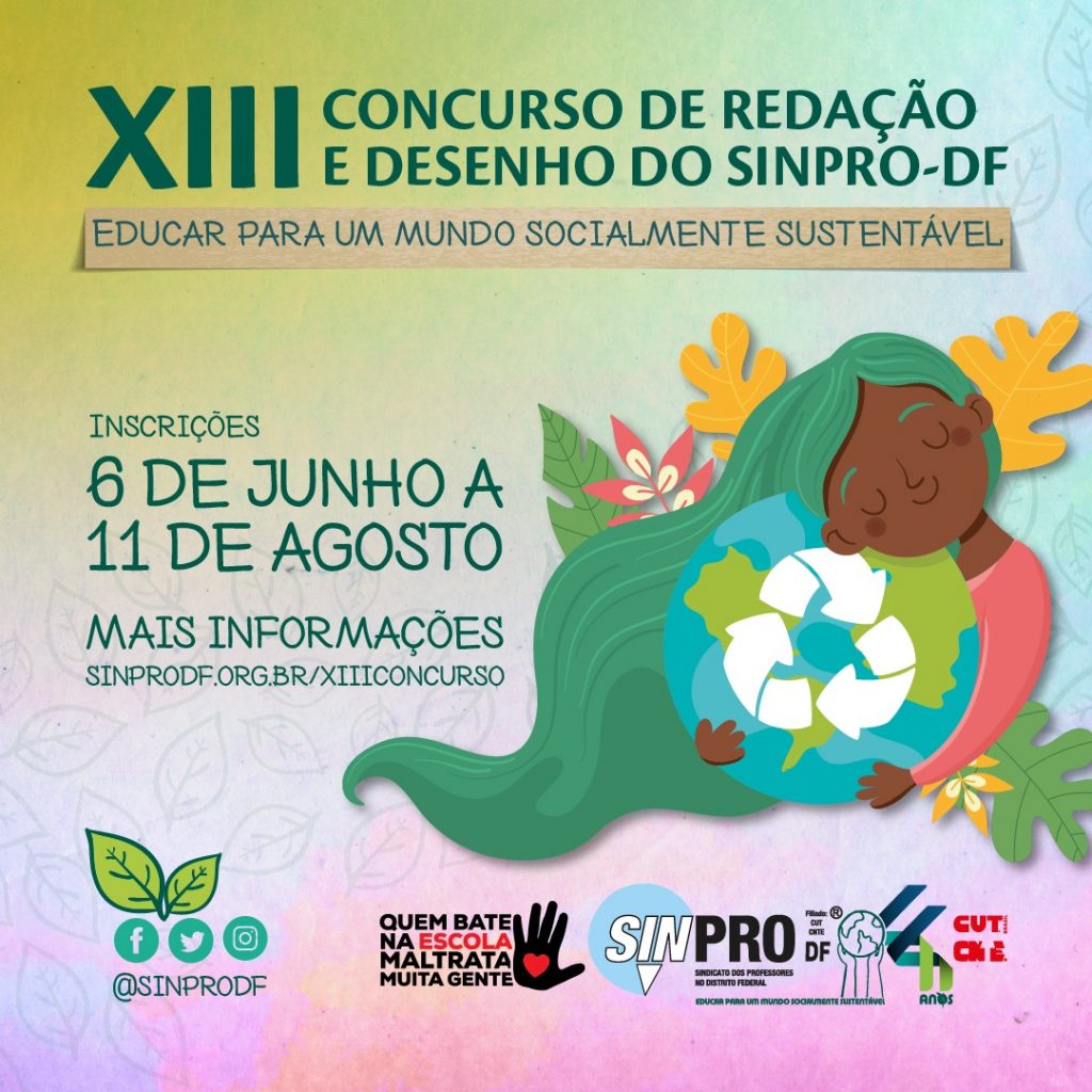 “Educar para um mundo socialmente sustentável” é tema do XIII Concurso de Redação e Desenho do Sinpro-DF. A atividade, lançada na terça-feira (6/6), é gratuita e direcionada a estudantes da rede pública de ensino. As inscrições para o concurso começaram no dia 06 de maio e vão até 11 de agosto. Faça AQUI sua inscrição.