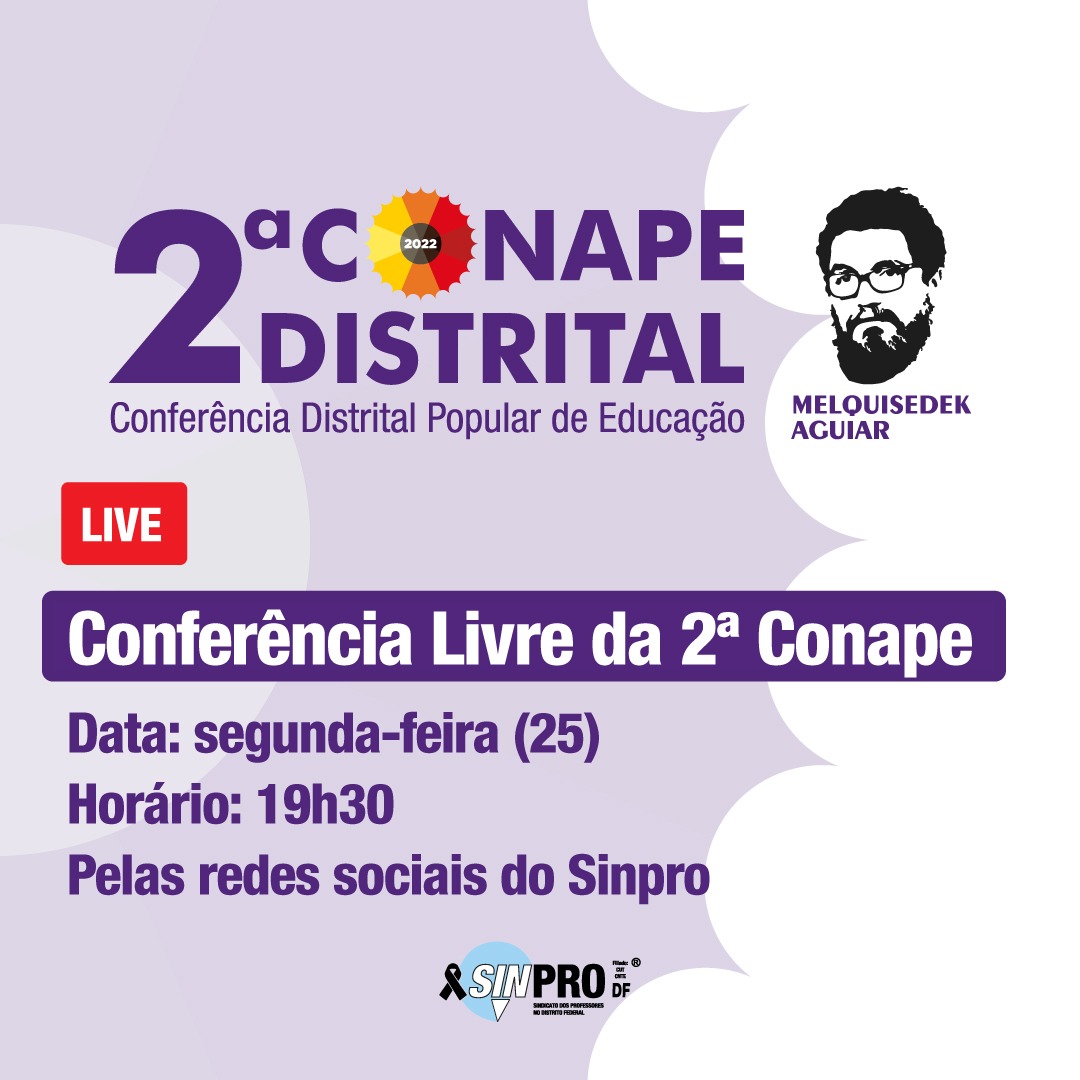A Conferência Livre é uma das atividades que antecedem a 2ª CONAPE Distrital Melquisedek Garcia, que ocorre no dia 29 de abril, na Escola de Aperfeiçoamento dos Profissionais da Educação (EAPE), e ocorre em um contexto de retrocessos econômicos, políticos, educacionais, ambientais, entre outros, que o Brasil vive hoje. Além de outros debates, a conferência é realizada para discutir a melhor forma de resistir aos ataques dos privatistas e de assegurar esta conquista histórica prevista na Constituição Federal como um direito fundamental. É com esse pensamento que a diretoria colegiada do Sinpro-DF e o Fórum Distrital de Educação (FDE), organizadores do evento, convidam a todos(as) para se inscreverem e participarem da 2ª CONAPE Distrital Melquisedek Garcia.
