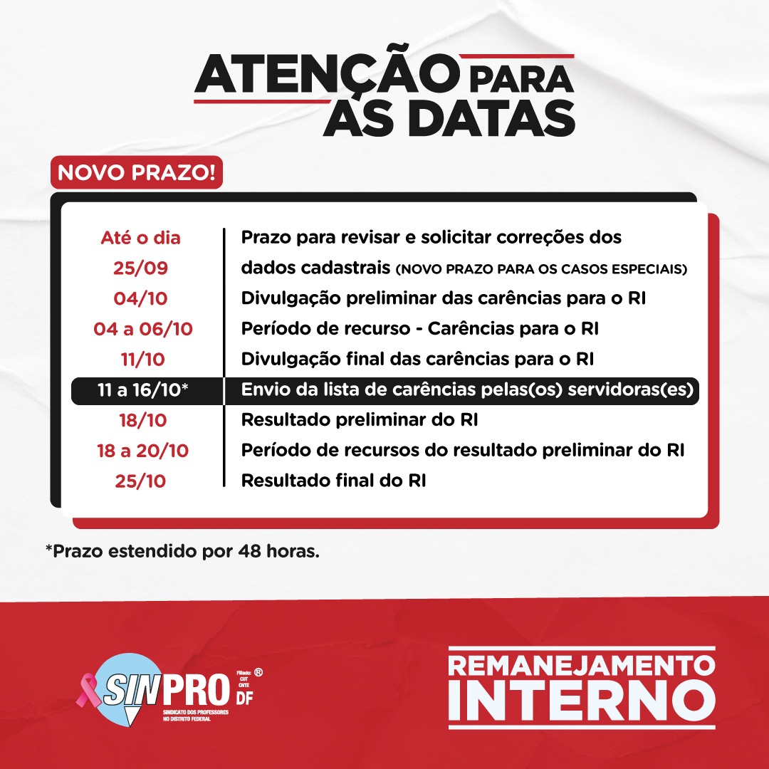 Lembrando que o Sinpro preparou uma tabela completa com as datas do Remanejamento Interno e Externo 2022/2023 e um card que será publicado a cada etapa do processo. Para participar do procedimento e acompanhar as fases constantes no processo, os(as) interessados(as) devem acessar o Sistema Integrado de Gestão de Pessoas (Sigep). O Procedimento de Remanejamento é regulado pelas normas contidas no edital e é disponibilizado e efetivado via Internet, no site sigep.se.df.gov.br, por meio do Sistema Integrado de Gestão de Pessoas (Sigep).
