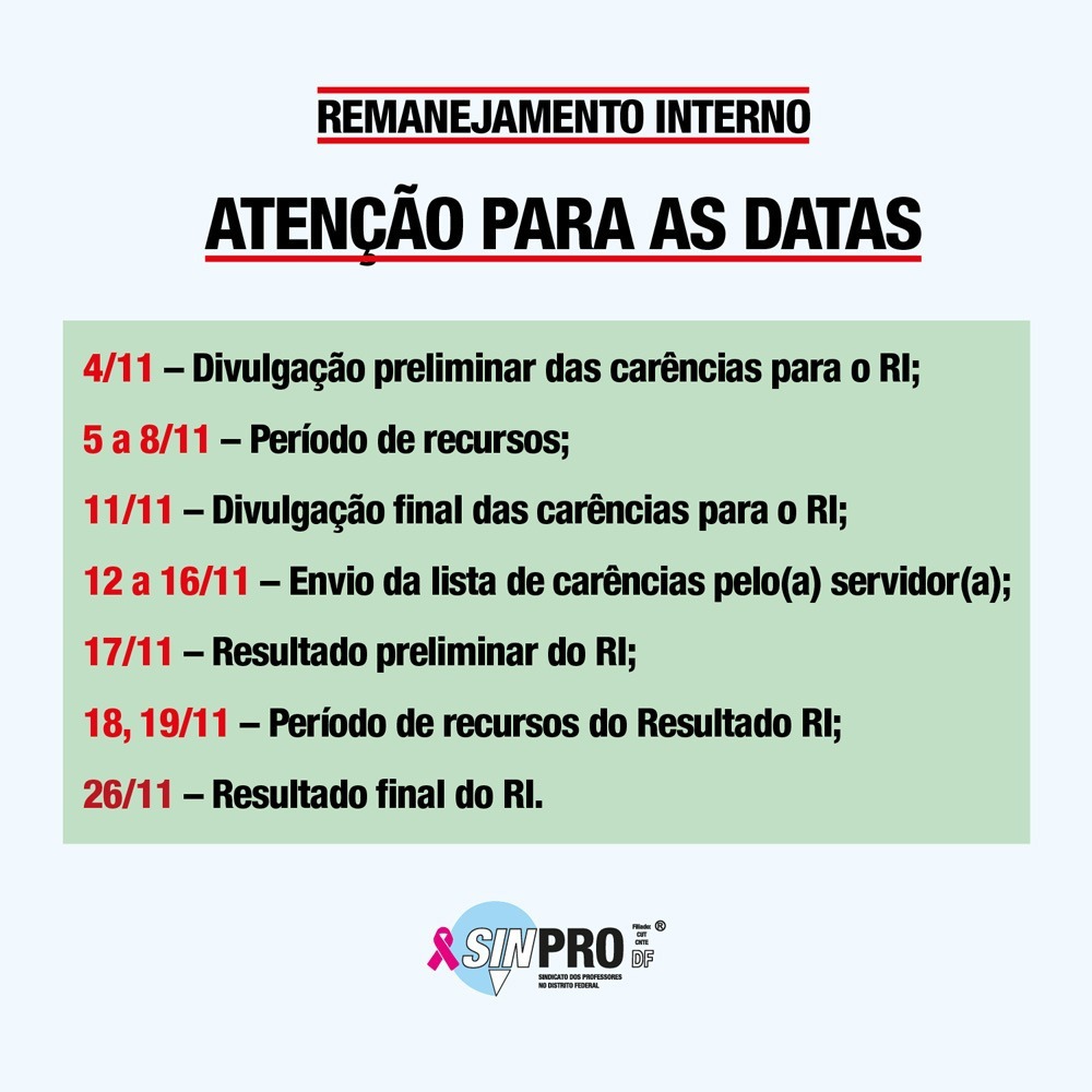 Dia 17, é divulgado o resultado preliminar do remanejamento interno (RI). Dias 18 e 19 são recebidos os recursos; e dia 26 de novembro sai o resultado final, conforme calendário apresentado no card abaixo. O resultado final geral será publicado dia 17 de dezembro.