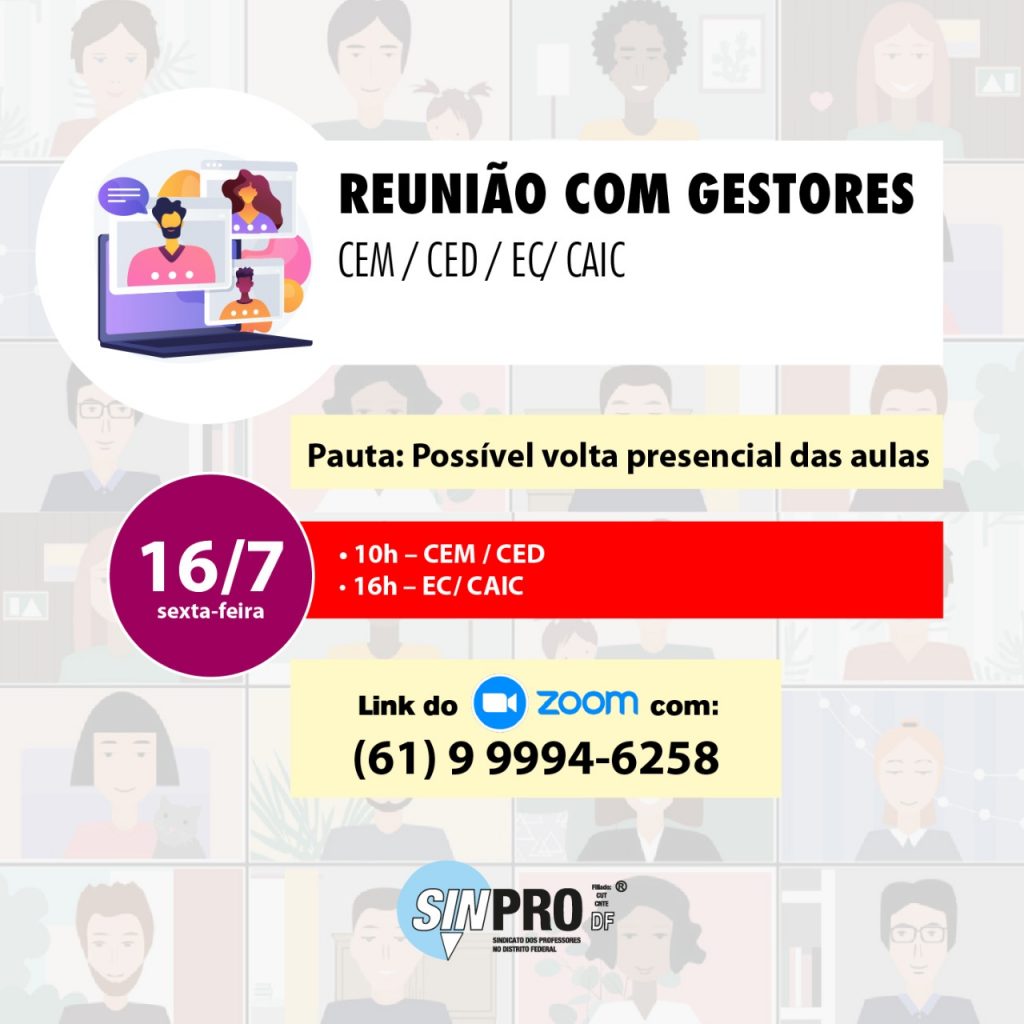 Este é o sexto dia da jornada de reuniões com gestoras/es, realizada pelo Sinpro-DF. O objetivo é identificar fragilidades e pensar coletivamente as soluções para os problemas que se apresentam quando o tema é o retorno presencial às aulas em meio à pandemia da covid-19.