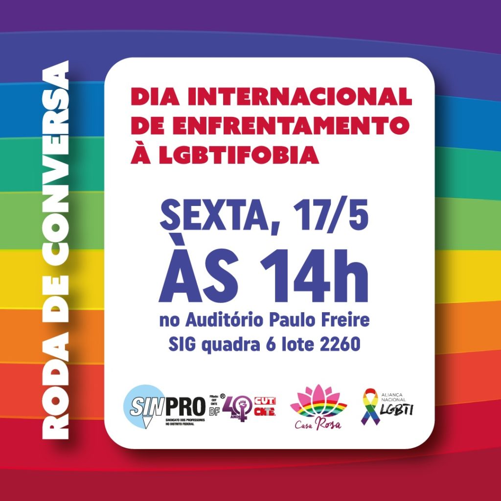 O Sinpro, por meio da Secretaria de Raça e Sexualidade, promove uma Roda de Conversa nessa sexta-feira, dia 17 de maio, às 14h, no auditório do Sinpro (SIG Quadra 6, Lote 2260). A atividade terá a parceria da Casa Rosa e tem como objetivo fortalecer as atividades do Dia Internacional de Enfrentamento à LGBTIFOBIA.