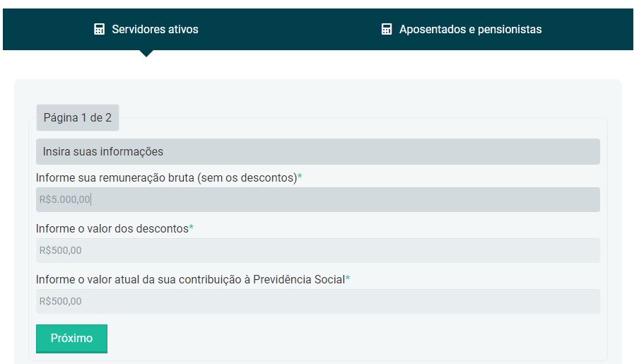 Ao acessar a calculadora, o servidor deverá indicar no campo apropriado se é ativo, aposentado ou pensionista. Não é necessário informar dados pessoais. Além disso, é preciso informar a remuneração bruta, o valor dos descontos e o valor da atual contribuição à Previdência Social, dados que constam no contracheque do servidor. “No caso do servidor ativo, o cálculo é exato. Já os servidores aposentados, o cálculo é aproximado, pois para que o cálculo fosse exato, seriam necessárias informações que fariam o cálculo ficar muito complexo. Existem também aposentados que não têm desconto previdenciário e, a partir de agora, terão. Para esses, especialmente, o cálculo é aproximado”, informa o advogado Lucas Mori, da Resende Mori e Fontes Advocacia, que presta assessoria Jurídica para o Sinpro-DF.