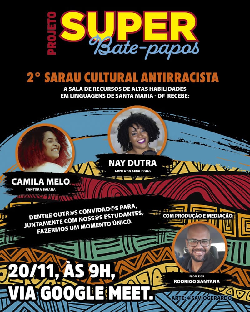 A Sala de Recursos de Altas Habilidades em Linguagens de Santa Maria realiza, no dia 20 de novembro, às 9h, o 2º Sarau Cultural Antirracista. O projeto Super Bate-papos nasceu a partir da curiosidade dos estudantes da Sala de Recursos, e junto com ele surgiu a ideia do Sarau Cultural Antirracista, que está indo para a segunda edição. A primeira ocorreu em dezembro de 2020.