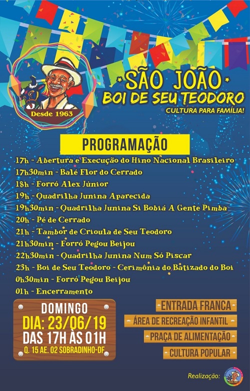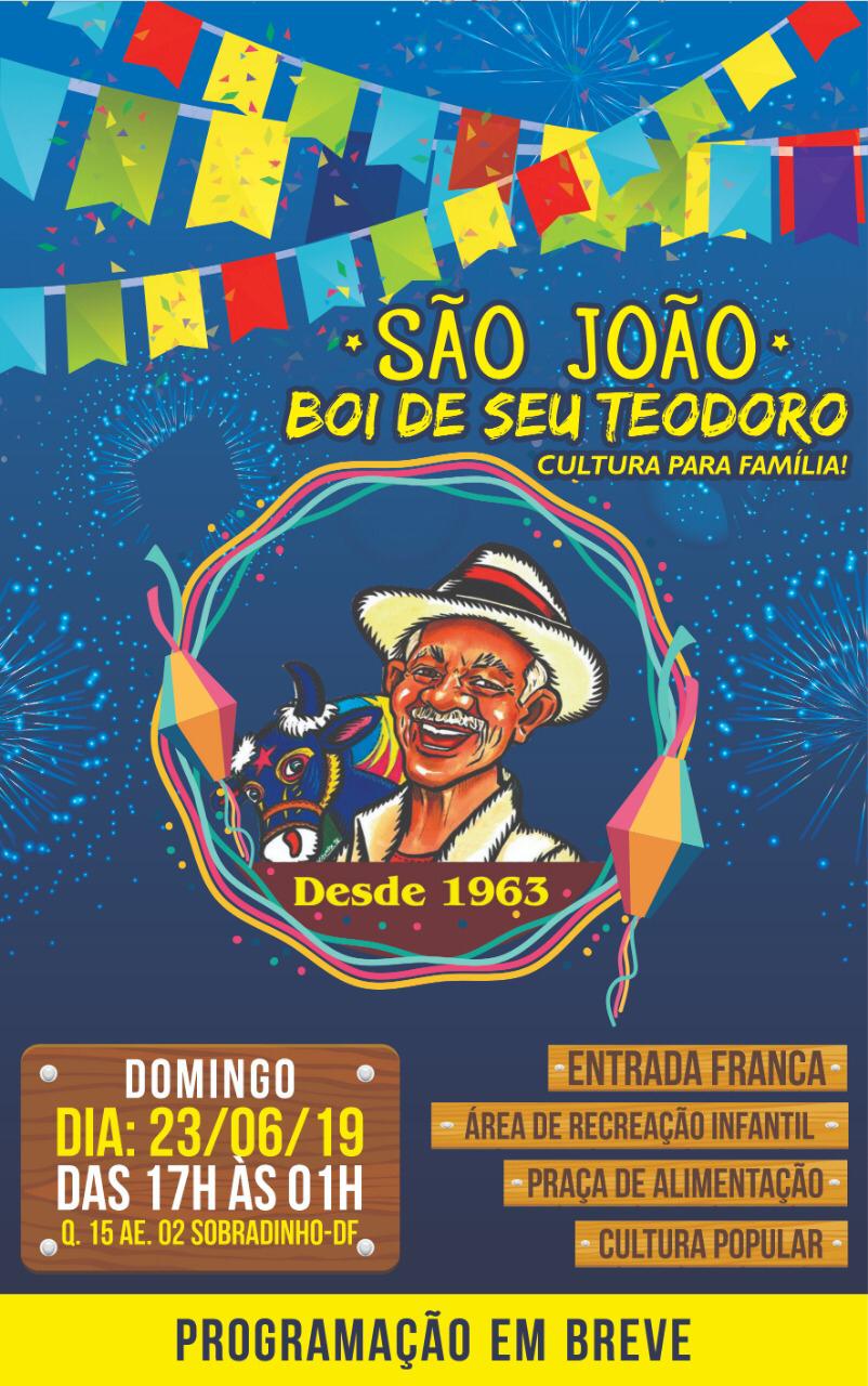 São João com o Boi de seu Teodoro é neste domingo (23), das 19h a 01h, na Quadra 15, Área Especial (AE) 02, Sobradinho. Compareça!  A entrada é franca, terá área de recreação infantil, praça de alimentação e muita cultura popular. O São João Boi de seu Teodoro é cultura para a família! Confira a programação.