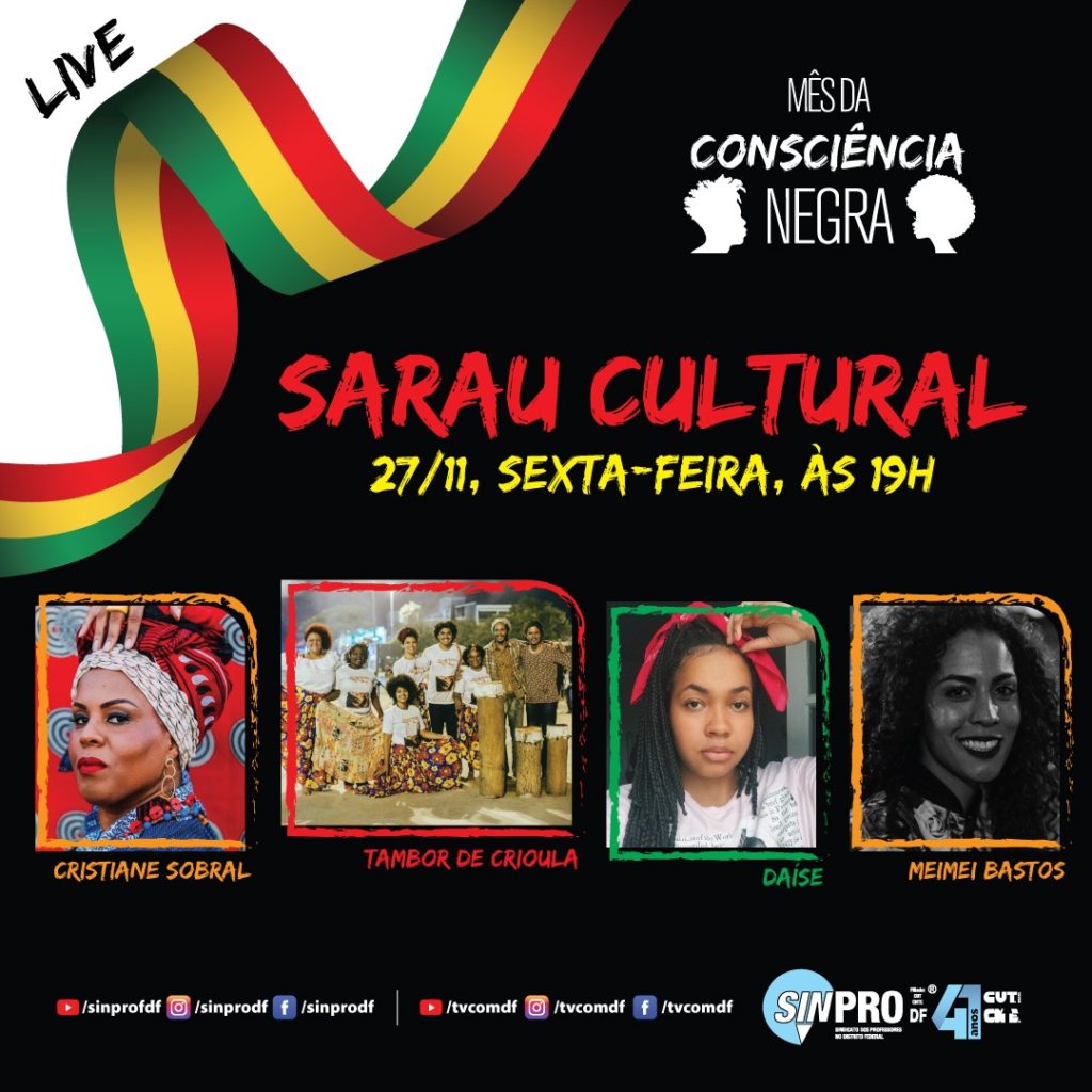 Após três debates importantes sobre temas que valorizam as culturas de matrizes africanas e promovem reflexões sobre a realidade imposta à população negra, a série do Mês da Consciência Negra realizada pelo Sinpro-DF será encerrada com chave de ouro. Nesta sexta-feira (27), às 19h, artistas negras da cidade apresentam o Sarau Cultural. A transmissão será pelas páginas do Sinpro-DF no Facebook e Youtube, e no nosso perfil no Instagram.