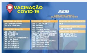 A Secretaria de Saúde do GDF divulgou, na noite desta quinta-feira, 9, os locais para aplicação de reforço do imunizante da Janssen para pessoas vacinadas com primeira dose até 30 de junho.