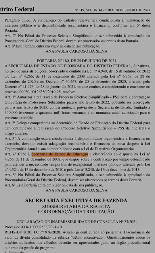 Confira a página 3 do DODF na qual foi publicada a portaria. Acesse o PDF completo aqui