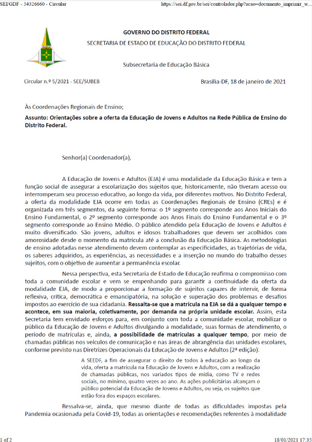 SEEDF reafirma Circular nº 5 e diz que não vai fechar turmas da EJA