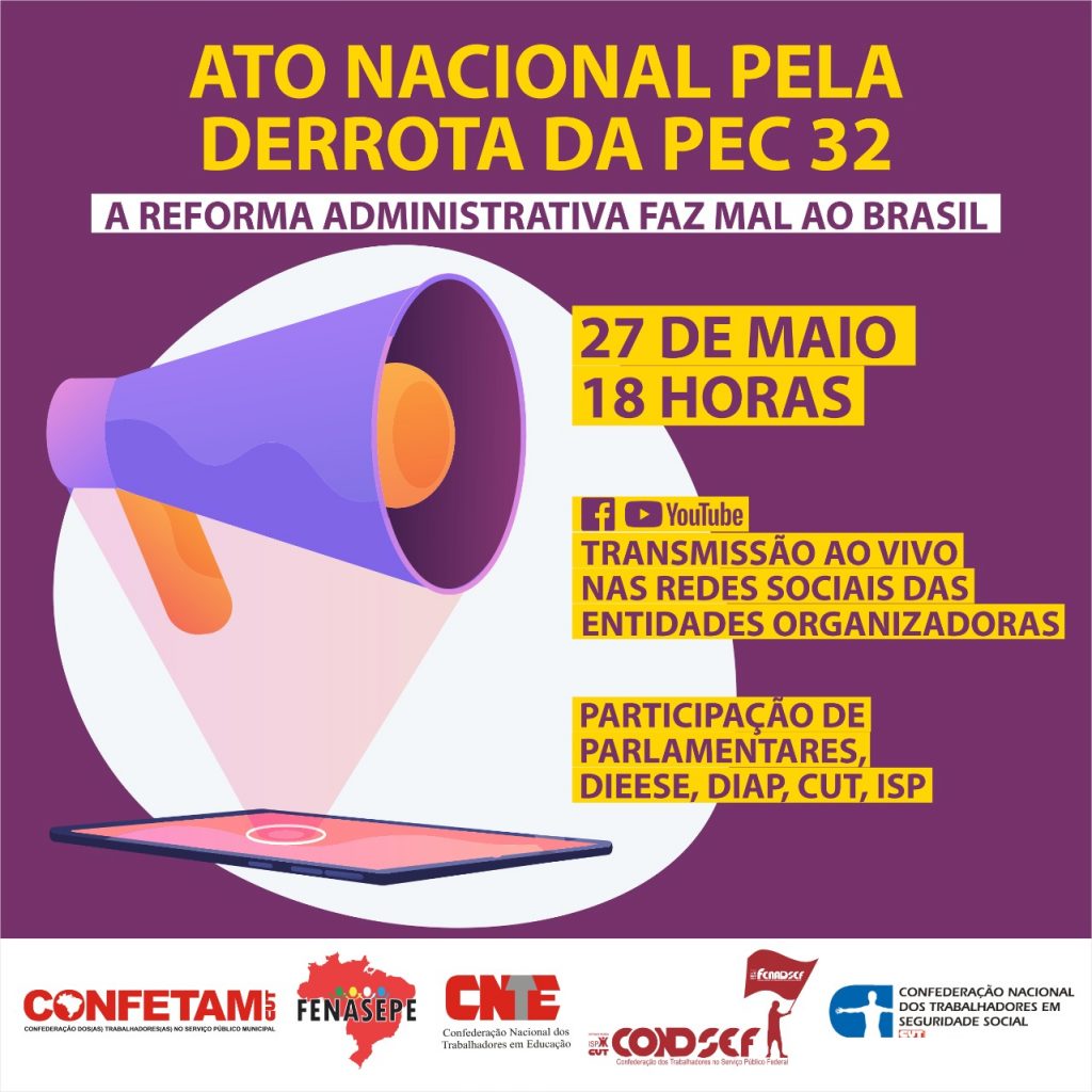 Na próxima quinta-feira (27), às 18h, a Confederação Nacional de Trabalhadores em Educação (CNTE) realiza o Ato Nacional pela Derrota da PEC 32 – A Reforma Administrativa faz mal ao Brasil. O evento será retransmitido pelas redes sociais da CNTE e é mais uma atividade contra esta PEC.