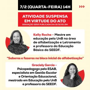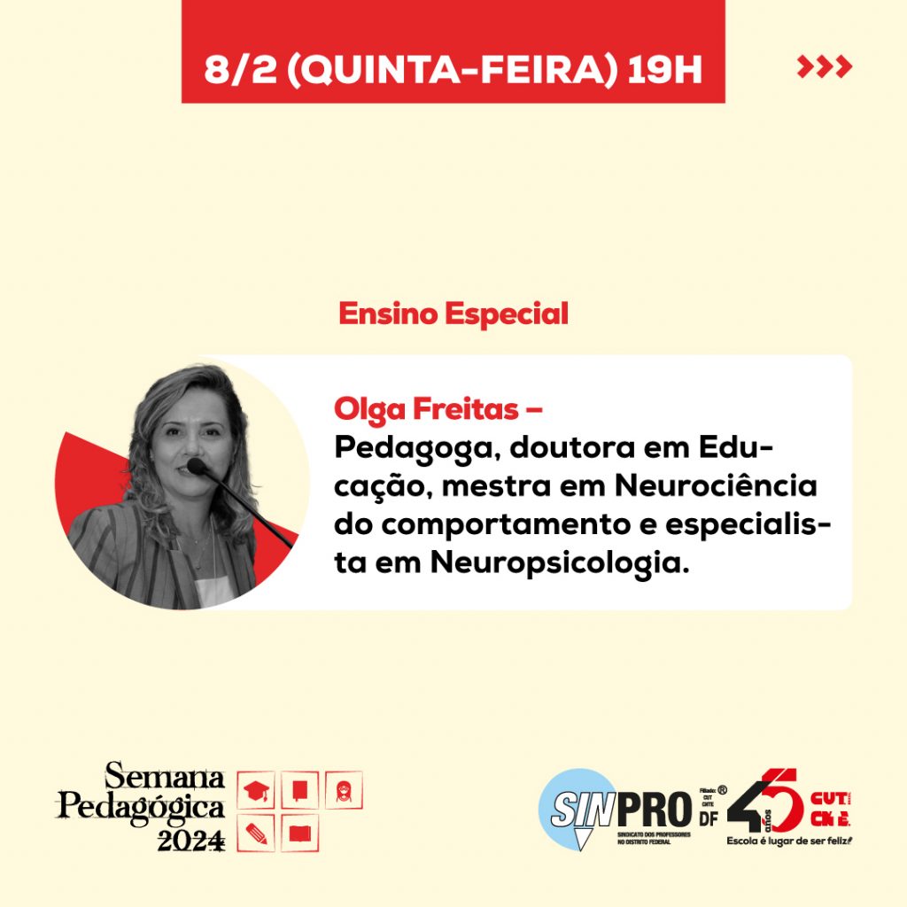 Começa nesta quarta-feira (07/02) a Semana Pedagógica do Sinpro, mas em virtude do Ato pela Educação Pública, que será realizado nesta quarta-feira (07), a partir das 15h, com concentração na plataforma superior da Rodoviária do Plano Piloto, a programação da Semana Pedagógica será suspensa no período da tarde, porém a gravação será realizada internamente com as palestrantes que já estavam agendadas, porém será publicada na quinta-feira (15), às 19h.