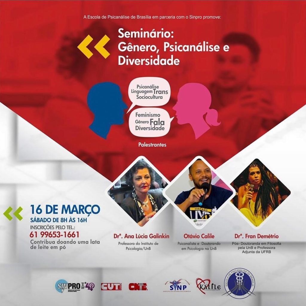 A Escola de Psicanálise de Brasília, em parceria com o Sinpro, realiza seminário sobre Gênero, Psicanálise e Diversidade neste sábado (16), das 8h às 16h, no Sindicato dos Professores (SIG, Quadra 6, Lote 2260). As inscrições podem ser feitas pelo telefone 99653-1661 ou clicando no link.