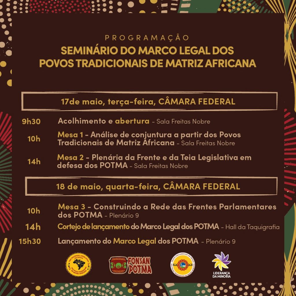 A Frente Parlamentar Mista Nacional em Defesa dos Povos Tradicionais de Matriz Africana, coordenada pela deputada federal Érika Kokay, e o Fórum Nacional de Segurança Alimentar e Nutricional dos Povos Tradicionais de Matriz Africana (FONSANPOTMA) realizam o Seminário do Marco Legal dos Povos Tradicionais de Matriz Africana (POTMA). O evento acontece dias 17 e 18 (terça e quarta) na Câmara dos Deputados.
