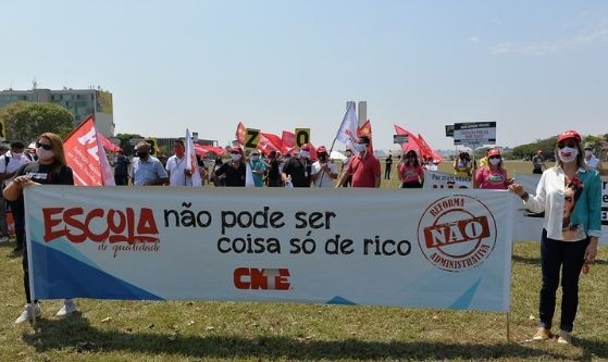 Com todas as precauções para evitar o contágio da Covid-19, os manifestantes estenderam faixas alertando para a gravidade dos problemas que cairão no colo da sociedade com uma possível aprovação da reforma administrativa. Uma delas, levada por dirigentes do Sinpro-DF, dizia: “Escola não pode ser coisa só de rico”. Uma faixa central ficou à frente com o alerta: “O povo tem direito a mais e melhores serviços públicos”.
