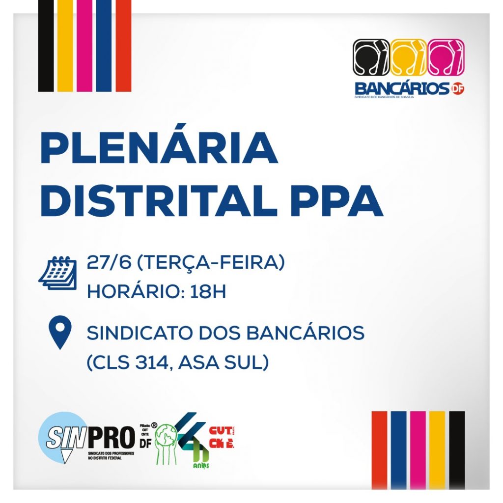 As plenárias estaduais são uma das etapas do PPA Participativo em que a sociedade fará a sua colaboração nas decisões sobre como o Governo Federal deverá aplicar os recursos públicos. Ocorrem até julho deste ano nas capitais dos 26 estados. Aqui no Distrito Federal, a plenária distrital foi marcada para o dia 27 de junho às 18h no Sindicato dos Bancários (CLS 314, na Asa Sul). Aqui você encontra o calendário com a programação e o formulário de inscrição para participar das plenárias.